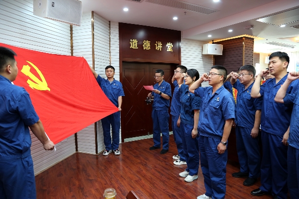 在鮮艷的黨旗輝映下,全體參會(huì)人員起立,黨委委員、紀(jì)委委員、副總經(jīng)理錢然帶領(lǐng)新黨員宣誓,全體參會(huì)黨員重溫入黨誓詞。在即將迎來中國共產(chǎn)黨成立102周年之際,黨的隊(duì)伍迎來了新鮮血液,高茂苒、姜世東、朱松強(qiáng)三位新黨員舉起右拳,一字一句鏗鏘有力的誓言代表了他們堅(jiān)定不移聽黨話、矢志不渝跟黨走的堅(jiān)定決心。