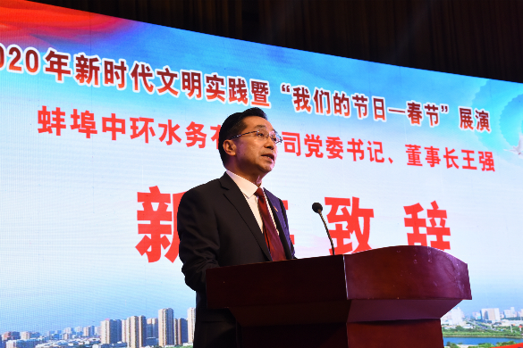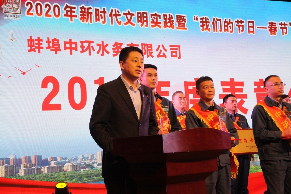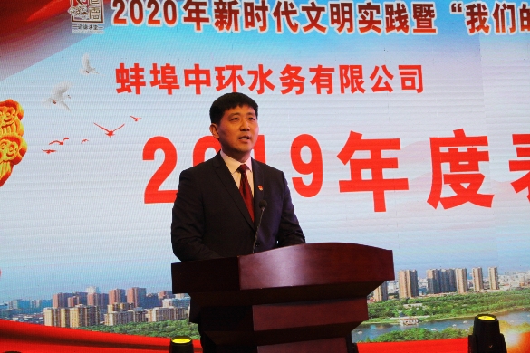一曲由蚌埠中環(huán)水務(wù)有限公司黨政班子成員和職工共同演唱的大合唱《光榮與夢想》氣勢恢宏,拉開了本次展演的序幕。緊接著,蚌埠中環(huán)水務(wù)黨委書記、董事長王強(qiáng)上臺發(fā)表新年致詞,向辛勤工作在各條戰(zhàn)線的同志以及到場的嘉賓致以了崇高的敬意和誠摯的新春問候?;厥走^去的一年,蚌埠中環(huán)水務(wù)不忘初心、牢記使命,用汗水澆灌收獲,以實(shí)干篤定前行,企業(yè)發(fā)展業(yè)績驕人,主題教育成果喜人,活動現(xiàn)場對2019年做出突出貢獻(xiàn)的先進(jìn)集體、中環(huán)模范進(jìn)行了表彰。