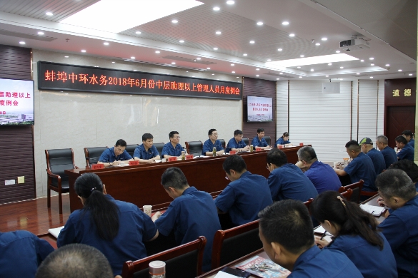 2018年6月19日下午,蚌埠中環(huán)水務(wù)有限公司在二樓綜合會議室召開2018年6月份中層助理以上管理人員月度例會,黨政領(lǐng)導(dǎo)班子成員、中層助理以上管理人員共100余人參加會議,黨委副書記、紀(jì)委書記傅益群主持會議。