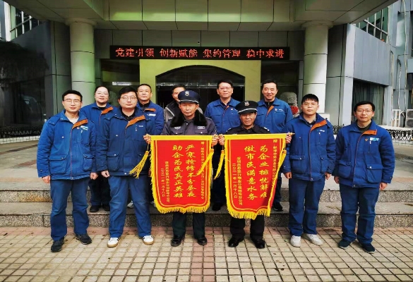 1月20日上午,國禎廣場小區(qū)的物業(yè)公司負(fù)責(zé)人和小區(qū)業(yè)主帶著兩面分別寫著“為企業(yè)排憂解難 做市民滿意水務(wù)”,“嚴(yán)寒搶修不分晝夜 助企為民真正英雄”的致謝旌旗,對營業(yè)一分所和二供中心,在寒潮冰凍天氣每天駐點(diǎn)小區(qū),不畏嚴(yán)寒進(jìn)行防凍排查和宣傳,排除萬難為用戶解決用水問題的真誠服務(wù),表示了衷心的感謝。