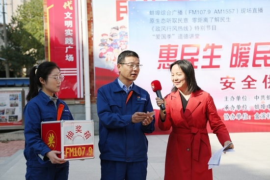 10月30日上午,由蚌埠市委宣傳部、市委督查考核辦主辦,蚌埠中環(huán)水務(wù)有限公司、蚌埠市廣播電視臺(tái)承辦、蚌山區(qū)金濱社區(qū)協(xié)辦的政風(fēng)行風(fēng)熱線走進(jìn)社區(qū)活動(dòng)在金濱社區(qū)拉開(kāi)帷幕。蚌埠中環(huán)黨委副書(shū)記、總經(jīng)理徐波做客蚌埠新聞綜合廣播《政風(fēng)行風(fēng)熱線—惠民生 暖民心 我為群眾辦實(shí)事》直播現(xiàn)場(chǎng)。公司黨委書(shū)記、董事長(zhǎng)吳勇及領(lǐng)導(dǎo)班子成員親臨直播現(xiàn)場(chǎng),近距離“聽(tīng)民聲”, 零距離“解民憂”。