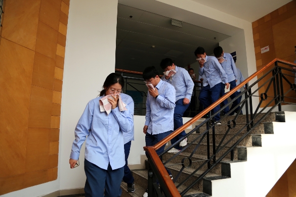 會議室內(nèi)參加培訓人員及樓內(nèi)其他在崗職工在現(xiàn)場指揮下達指令后,共同有序撤離至安全區(qū)域。參演職工用濕毛巾捂住口鼻,彎腰低姿,整個疏散過程緊張有序,各樓層引導人員確保疏散通道暢通無阻。