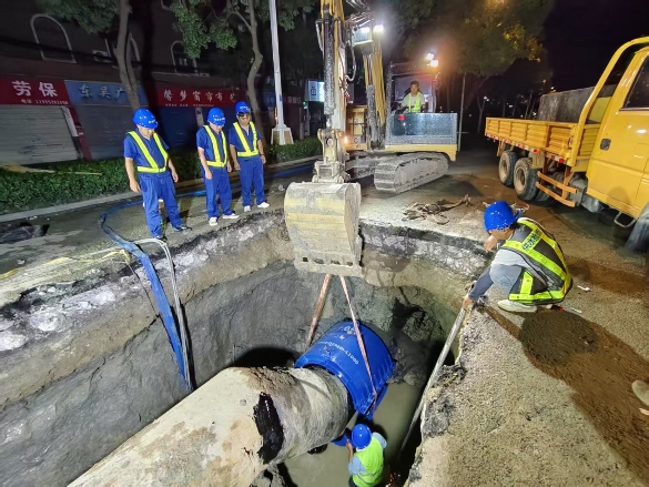公司黨委書記、董事長錢然,黨委副書記、總經(jīng)理徐波,副總經(jīng)理張自強(qiáng)前往現(xiàn)場指導(dǎo)搶修工作。經(jīng)排查,爆裂管道為運(yùn)行近30年的DN900mm復(fù)合型鋼管,因年久導(dǎo)致管身出現(xiàn)多處銹蝕漏洞。