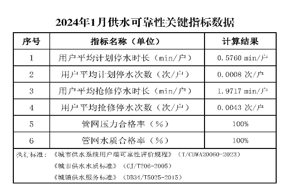 2024年1月份供水可靠性關(guān)鍵指標(biāo)數(shù)據(jù)公示