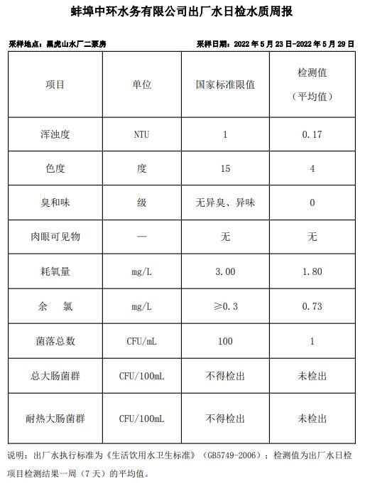 蚌埠中環(huán)水務(wù)有限公司出廠水日檢水質(zhì)周報(bào)(2022年5月23日-2022年5月29日)