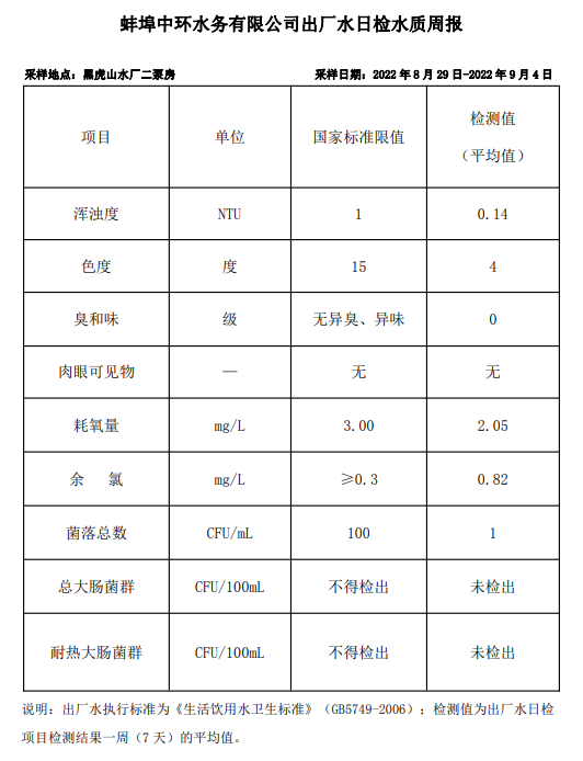 蚌埠中環(huán)水務(wù)有限公司出廠水日檢水質(zhì)周報(2022年8月29日-2022年9月4日)