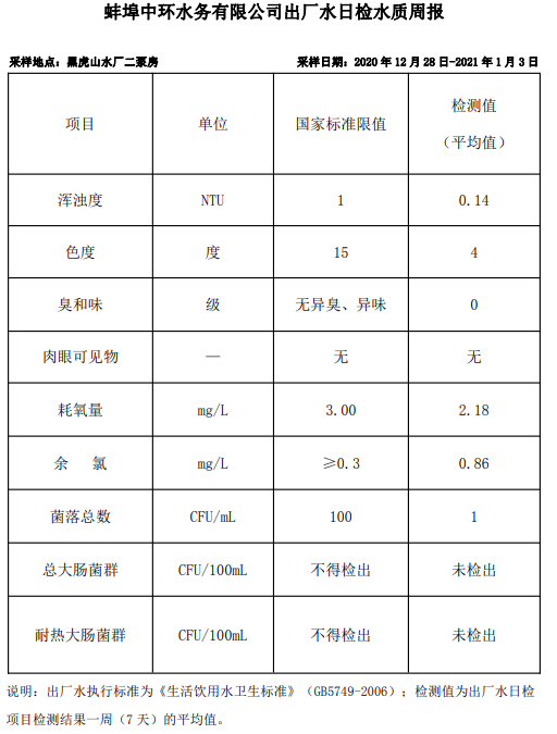 蚌埠中環(huán)水務有限公司出廠水日檢水質周報(2020年12月28日-2021年1月3日)