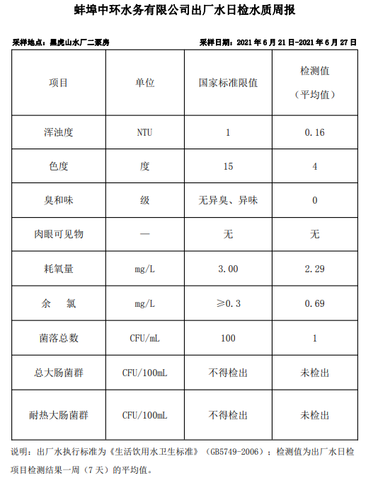 蚌埠中環(huán)水務(wù)有限公司出廠水日檢水質(zhì)周報(2021年6月21日-2021年6月27日)