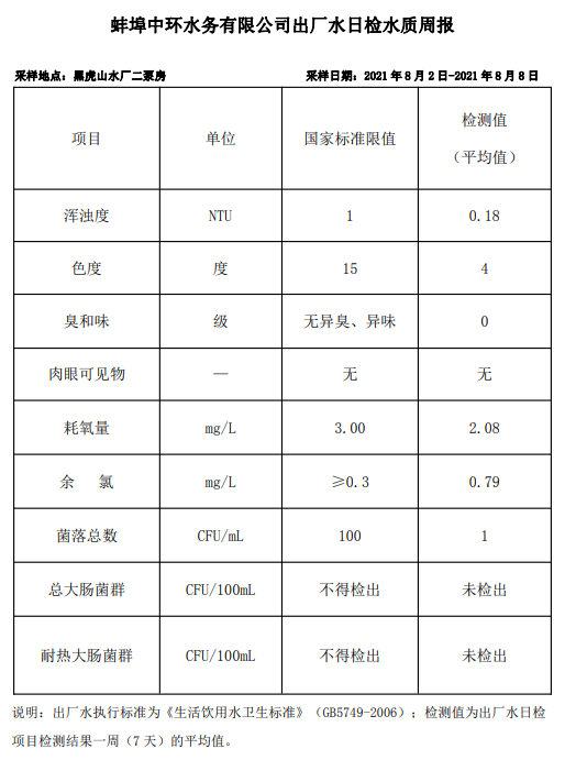 蚌埠中環(huán)水務(wù)有限公司出廠水日檢水質(zhì)周報(bào)(2021年8月2日-2021年8月8日)