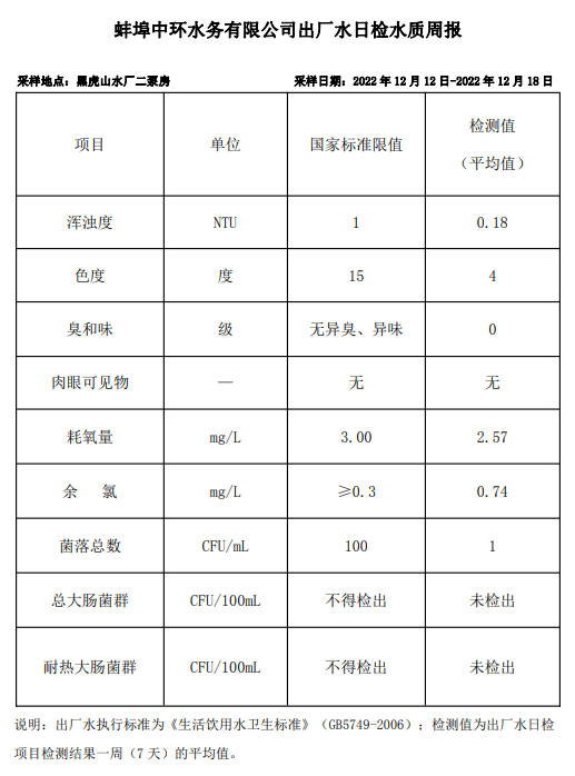 蚌埠中環(huán)水務(wù)有限公司出廠水日檢水質(zhì)周報(bào)(2022年12月12日-2022年12月18日)