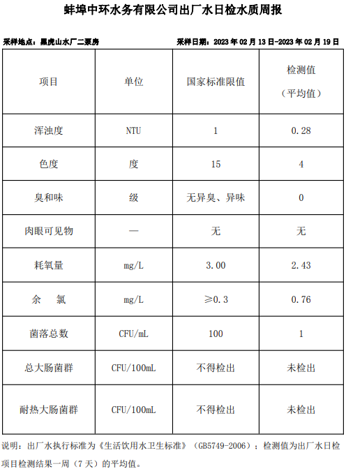 蚌埠中環(huán)水務(wù)有限公司出廠水日檢水質(zhì)周報(2023年02月13日-2023年02月19日)