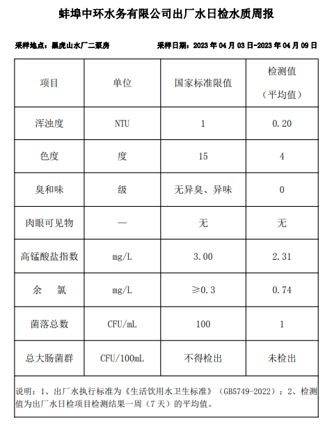 蚌埠中環(huán)水務有限公司出廠水日檢水質周報(2023年04月03日-2023年04月09日)