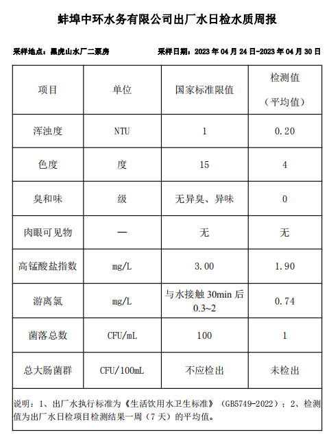 蚌埠中環(huán)水務(wù)有限公司出廠水日檢水質(zhì)周報(bào)(2023年04月24日-2023年04月30日)