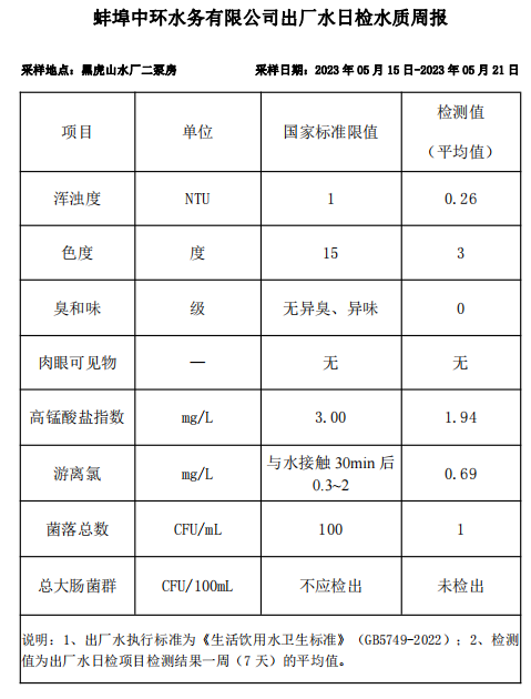 蚌埠中環(huán)水務(wù)有限公司出廠水日檢水質(zhì)周報((2023年05月15日-2023年05月21日)