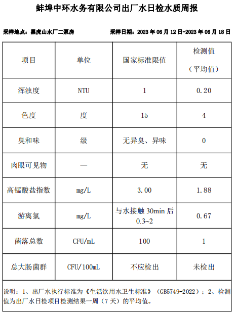 蚌埠中環(huán)水務(wù)有限公司出廠水日檢水質(zhì)周報(bào)(2023年06月12日-2023年06月18日)