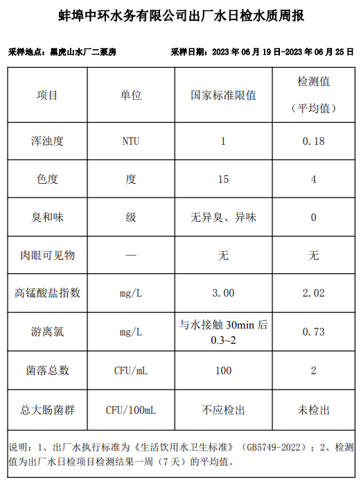 蚌埠中環(huán)水務(wù)有限公司出廠水日檢水質(zhì)周報(bào)(2023年06月19日-2023年06月25日)