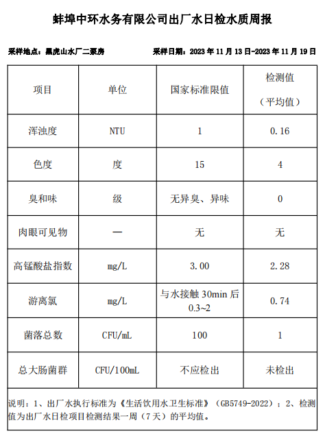 蚌埠中環(huán)水務(wù)有限公司出廠水日檢水質(zhì)周報(bào)(2023年11月13日-2023年11月19日)