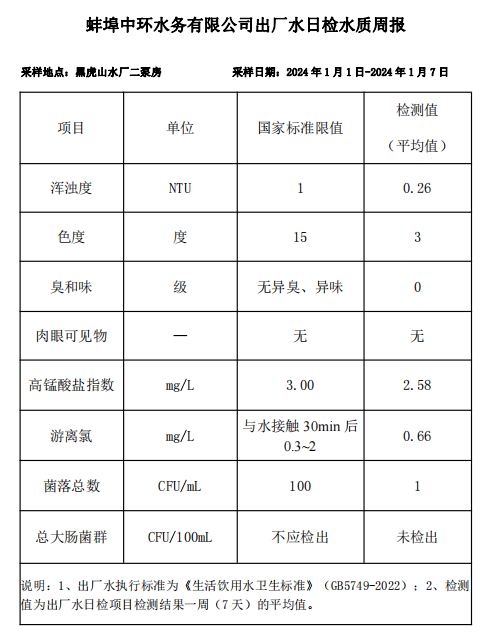 蚌埠中環(huán)水務(wù)有限公司出廠水日檢水質(zhì)周報(2024年1月1日-2024年1月7日)