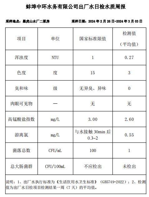 蚌埠中環(huán)水務有限公司出廠水日檢水質(zhì)周報(2024年2月26日-2024年3月03日)
