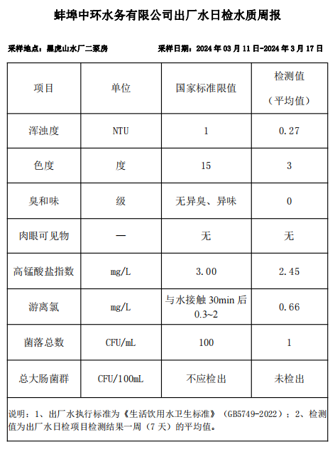 蚌埠中環(huán)水務(wù)有限公司出廠水日檢水質(zhì)周報(bào)(2024年03月11日-2024年3月17日)