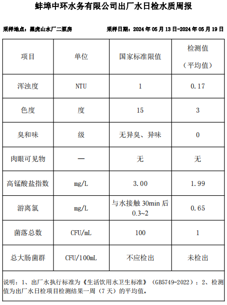 蚌埠中環(huán)水務(wù)有限公司出廠水日檢水質(zhì)周報(2024年05月13日-2024年05月19日)