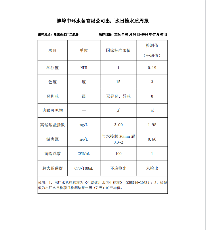 蚌埠中環(huán)水務有限公司出廠水日檢水質周報(2024年07月01日-2024年07月07日)