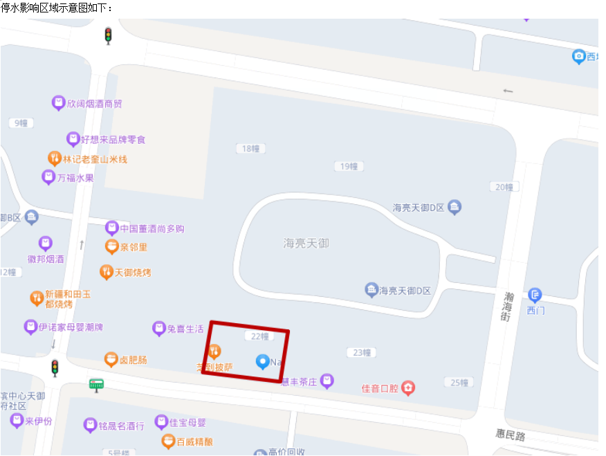 停水區(qū)域:海亮天御22號(hào)樓用戶。
