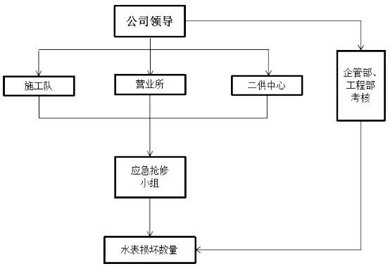 (一)應急處理措施 成立防寒抗凍應急指揮部,工程一處、工程二處、鯤鵬公司、政通公司、誠信公司、管線所、二供中心為應急搶修隊,協助營業(yè)各分所做好防凍期間保溫安裝、水表更換、管道維修、人員使用登記以及特殊情況下的解凍工作。根據等級分類,由領導小組宣布啟動應急響應。 Ⅲ級處理措施: (1)營業(yè)各分所在寒潮天氣來臨之前,聯系小區(qū)物業(yè)關閉樓梯門窗,在寒潮期間,將電梯設置成最高處等待,避免因漏水造成的電梯損壞。 (2)營業(yè)各分所可建立小區(qū)用戶防凍保溫微信群,用橫幅、小喇叭、微信群等方式宣傳長流水等防凍常識。同時,在小區(qū)單元口張貼宣傳單。 (3)公司可通過電視臺、廣播電臺、報紙等媒體宣傳防寒防凍常識。 (4)各施工單位派專人駐點營業(yè)各分所,配合處理應急保障工作。 Ⅰ、Ⅱ級處理措施: (1)在Ⅲ級響應基礎上,重點做好以下工作,各營業(yè)所分所做好災情的統計分析及上報工作。應急處理期間,公司防凍指揮部需及時將應急處置辦法及信息向政府主管部門報告。指定新聞發(fā)言人,及時將應急處置信息通過媒體等渠道發(fā)布,做好輿情、監(jiān)控輿論引導和宣傳報道工作。 (2)低溫寒潮天氣來臨,以營業(yè)各分所為駐點,成立應急搶險隊,由各分所長可通過對小區(qū)受凍的嚴重程度和距離遠近分組,合理分配人員及搶修物資,受凍嚴重小區(qū)安排人員駐點留守,統一協調、指揮、部署本區(qū)域防寒抗凍的應急處置、搶險搶修、恢復供水等各項工作。 (3)應急搶險隊應對凍損事件及應急信息認真核實,并及時向公司報告處置情況,特別是重點,大面積、敏感事件。 (4)對于已出現上凍的用戶,對生活造成影響,但未形成大面積受凍的,可在每單元設立臨時供水點。對于大面積受凍且無法設置臨時供水點的,采取應急送水服務。 (5)對于戶表上凍用戶,判斷上凍位置(支管、立管、入戶彎頭)根據位置進行解凍,可使用電伴熱帶加熱解凍,應由專業(yè)人員操作,無法解凍的做好用戶的解釋安撫工作。 (6)對于凍損水表的更換,施工隊人員必須根據營業(yè)所提供的水表型號領取,并對地址、型號、數量進行登記。 (二)后期處理及考核 (1)更換凍損水表和管道維修數據由營業(yè)所上報至指揮中心匯總。 (2)由領導小組指定的部門,對凍害造成的次生災害損失進行調查,收集現場證據做好保險理賠前期工作, (3)各分所以防凍結束后,以凍壞的水表數量作為工作質量依據,由人力資源部和工程部進行最終考核。