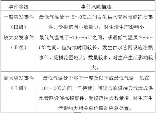 三、冬季供水防凍工作準備階段 (一)水表箱及供水附屬設施的排查及措施 10月1號起,營業(yè)各分所和相關部門需對轄區(qū)內不同類型的水表箱及供水附屬設施做好排查、上報和保溫工作,詳細內容如下: (1)埋地式水表上的排查 營業(yè)各分所應對轄區(qū)內的水表箱進行摸底排查。統計出所需的保溫棉數量。于10月25日前提交工程部審批后至公司材料部領取。保溫工作應在11月20號前全部完成,為保證全年售水量的指標完成以及避免保溫棉的鋪墊對抄表周期帶來的不便,是否能考慮將企管部對保溫棉的考核工作延遲到12月10號。備注:Ф50含以上不進行統計和鋪墊。 (2)嵌墻式、壁掛水表上排查 營業(yè)各分所應對嵌墻、壁掛式水表箱進行摸底排查,統計出水表①箱體損壞②門把手損壞關不嚴③后墻無保溫棉④門板無保溫棉⑤水表保溫是否完整。10月1日開始上報工程部,10天1周期,于10月30日前結束。由二供中心負責維修更換,保溫工作應在11月20日之前完成,水表箱一旦保溫完成后,請勿隨意打開。 (3)開放式管廊水表箱排查 營業(yè)各分所應將2021年1月1日前、后驗收的高層開放式管廊小區(qū)進行統計,將1月1日份前驗收的小區(qū)名單送至二供中心,1月1日份后驗收的小區(qū)名單送至與其對應的施工部門。二供中心和施工部門將對其進行保溫棉的排查和找補工作,排查內容:①水表井門是否關上后仍留有縫隙。②水表井門是否能關上。③水表井內部是否有掛保溫毛毯。④水表井內部水表及管道保溫棉是否完整。10月30日前報送至工程部備案審核,保溫工作應在11月20號前全部完成。對于出現①現象,工作人員應利用膠帶、密封條等工具進行完善,確保嚴絲合縫。出現②現象的,工作人員應加裝卡扣,保證密不透風。若其他現象如水表井內有建筑垃圾等,需另其備注及時整改。 (4)戶表外墻管排查 各營業(yè)分所應對轄區(qū)內戶表外墻管存在的破損、無保溫效果的進行統計,10月1日起上報二供中心,10天1周期,10月30日完成排查上報工作,二供中心應在11月20號前全部完成戶表外墻管的保溫工作。 (5)消防栓的排查 10月1日起,對消防栓進行集中排查,確保啟閉完好、泄水口通暢。地上式消防栓裸露部分應采取保溫材料包裹或相應的防凍措施,保溫材料應位于取水口以下嚴禁全部包裹或覆蓋保溫,應在11月20號前全部完成戶外地上式消防栓的保溫工作。 (二)水表的排查及措施 營業(yè)各分所在每年10月1日起對各高層小區(qū)進行摸底排查,排查內容:①頂層長流水用戶信息。②近一年的無人居住、歷年來受凍嚴重的開放式管廊和嵌墻式水表。10天一周期,于10月30日前結束報送至工程部審核。頂層長流水用戶信息應在11月20日前完成,由營業(yè)各分所自存。(備注:營業(yè)各分所應對去年受凍嚴重小區(qū)特別處理,要進行詳細的排查,各分所長是第一責任人)。 對于入住率的高低可采取以下方法進行靈活處理: (1)無人居住的樓棟:可采取立管(各壓力段)及用戶水表放空的方式,放空時間在12月10號前完成。 (2)用戶入住率較低的樓棟:可采用各壓力段管道頂端用戶長流水和無人用戶水表放空相結合的方式靈活處置,放空時間在12月10號前完成,長流水視氣象情況而定,由防凍應急指揮小組下達通知。 (3)有用戶居住的樓棟:在各壓力段管道頂端或相對頂端,采用常住用戶長流水的方式:選擇家中的一個水龍頭安裝一節(jié)軟管直通下水道,確保各壓力段供水管道不受凍可供水,且放出的水能夠完全排出,不會產生漫水等次生災害的發(fā)生,長流水視氣象情況而定,由防凍應急指揮小組下達通知。 (三)冬季防凍材料的準備 材料部門應根據各營業(yè)所上報的防凍保溫材料計劃,及時儲備膠帶、悶頭等各種防凍保溫材料和解凍設備,做好材料的發(fā)放和補充,確保隨用隨領。 四、冬季防凍工作應急處置及駐點階段 雨雪冰凍災害事件風險分級表1